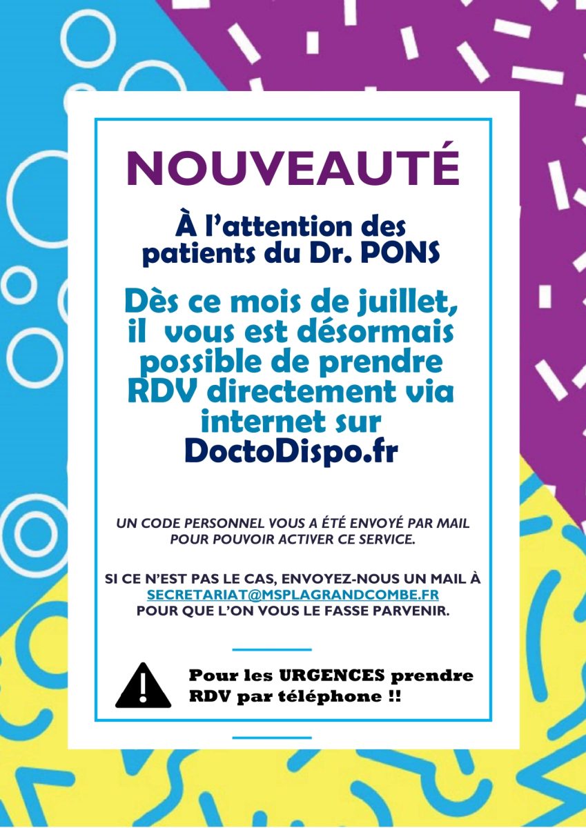 NOUVEAUTÉ – DoctoDispo prise RDV en ligne Dr. PONS